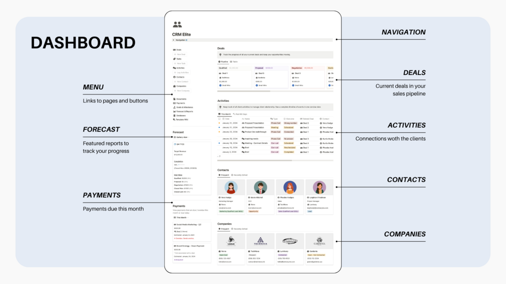 Welcome to our CRM Notion template - the all-in-one professional template designed to supercharge your business. This template is the ultimate solution to managing your customer relationships, streamlining your sales pipeline, and maximizing your business performance.